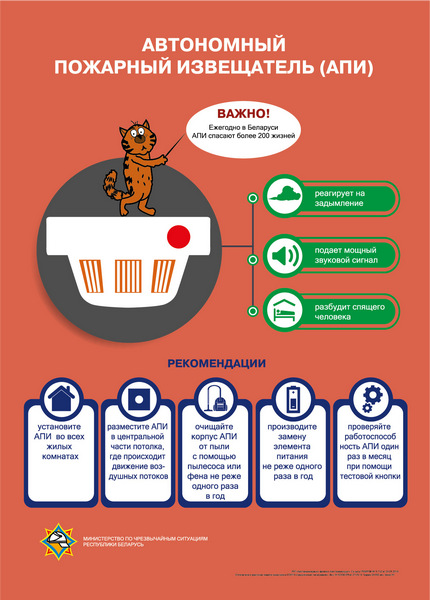 Автономный пожарный извещатель (АПИ) предназначен для автоматического обнаружения пожара (задымления) и оповещения о нем. Прибор может оповещать о пожаре самостоятельно или совместно в составе автономной системы пожарной сигнализации. АПИ называется автономным, поскольку его конструкция выполнена таким образом, что для работы ему не требуется подключение к электрической цепи и подсоединение к пульту управления. Внутри пластикового корпуса расположен источник питания – батарейка типа «Крона», компоненты, необходимые для обнаружения пожара и непосредственного оповещения о нем. Запомните! АПИ следует устанавливать во всех жилых комнатах (кроме кухни).