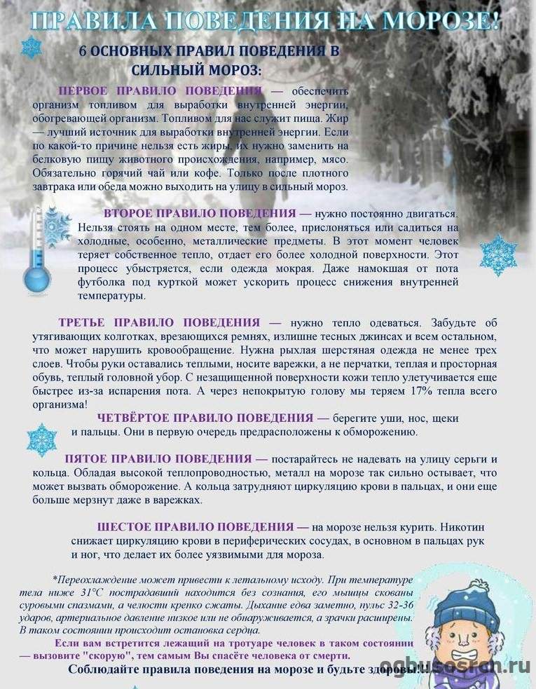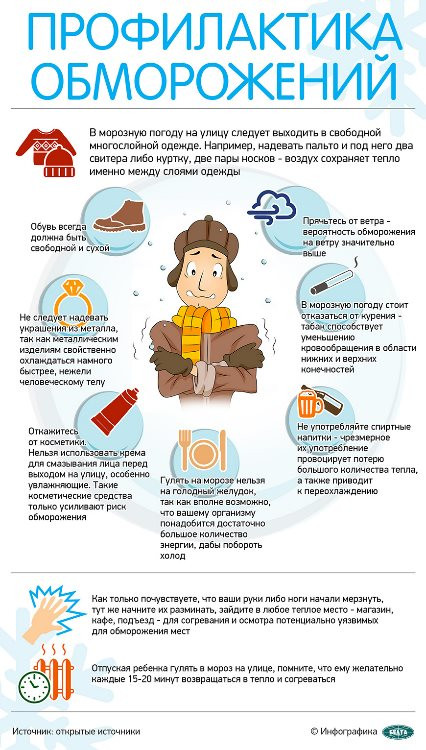 - Поведение: Не стойте на месте, двигайтесь. Не курите и не пейте алкоголь, так как они создают ложное чувство тепла и ухудшают циркуляцию крови, делая конечности более уязвимыми.