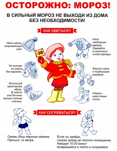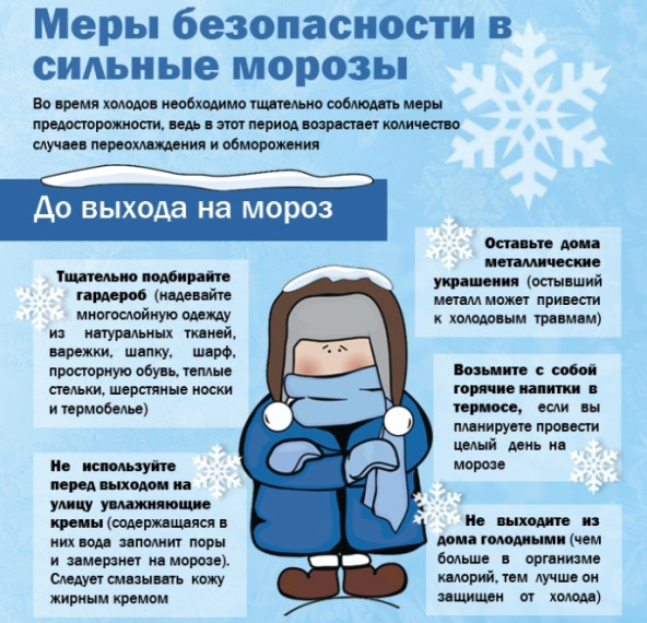 Чтобы уберечься в сильные морозы, одевайтесь многослойно и свободно, защищайте кожу лица кремом, избегайте алкоголя, курения и металлических украшений; на улице постоянно двигайтесь, дышите носом и прячьтесь от ветра; если замерзли, не отогревайте обмороженное снегом или горячей водой, а сухим теплом, и не снимайте обувь с отмороженных ног.